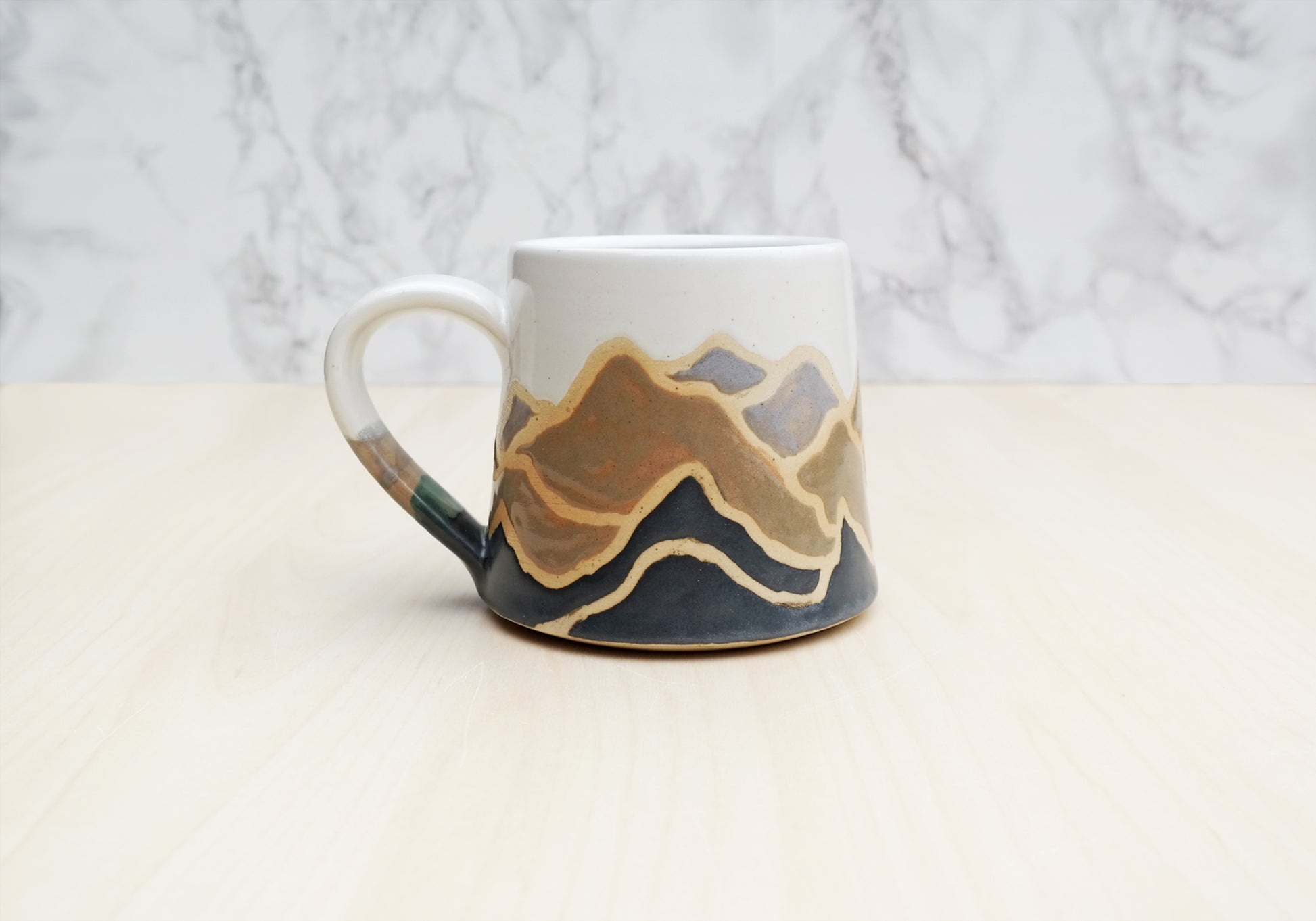 This is the mug you will want to use every single day - the shape is perfect to wrap your hands around and the landscape inspired design will have you dreaming of the mountains. Each mug is unique! Features a large comfortable handle and a tapered rim to keep your beverage extra warm.