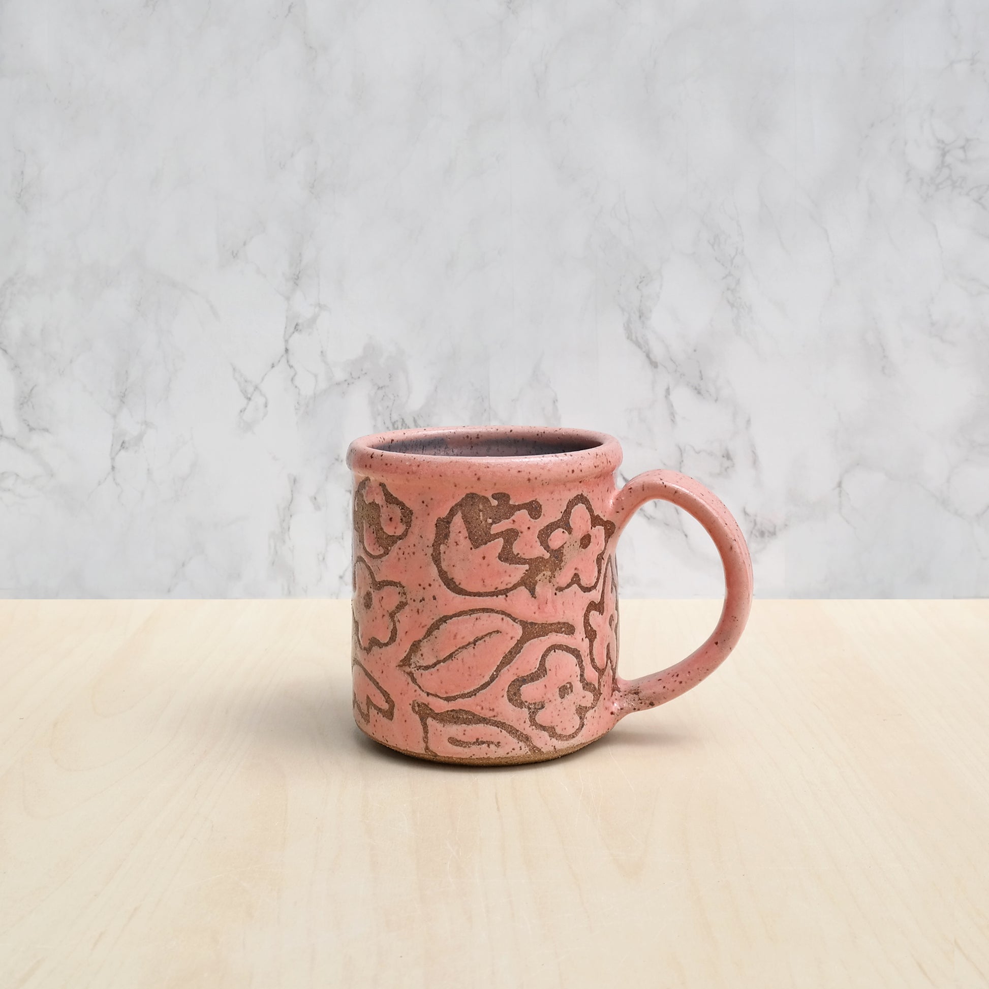 Each mug is created one at a time on a potter's wheel, finished with hand-mixed glazes (Tulip Pink) and fired in small batches over 2300°F.
