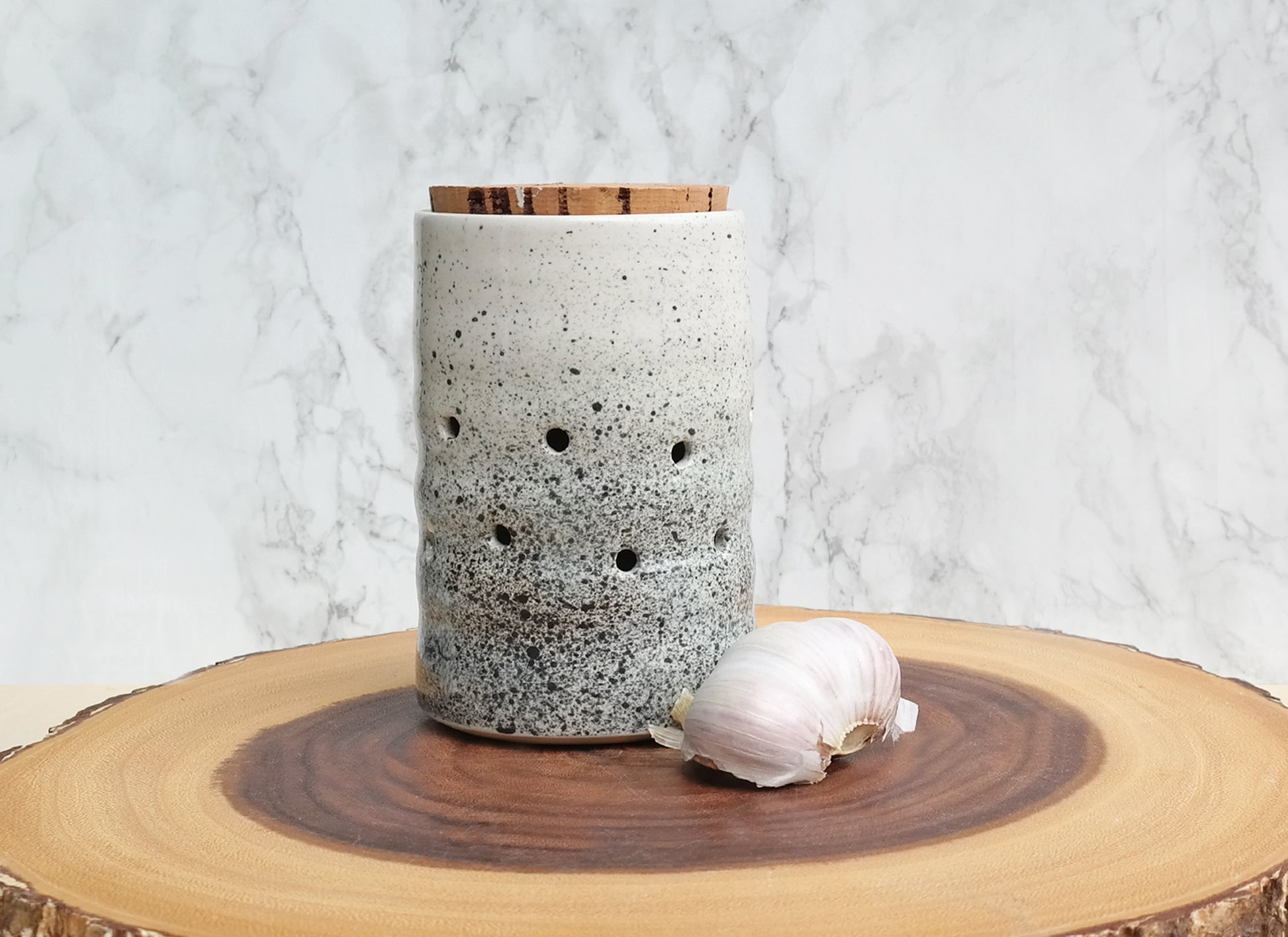 Handmade Ceramic & Cork Garlic Jar. Crafted from sturdy ceramic stoneware and finished off with a custom speckle glaze. And see those holes all over? They give much-needed air circulation. The cork lid keeps light and moisture at bay, so your bulbs won’t start sprouting on you. Yeah...this one isn’t leaving the countertop.
