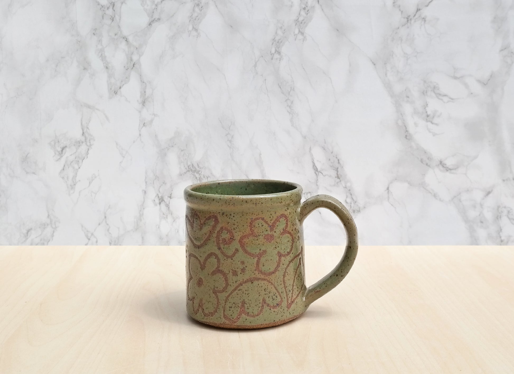 Each mug is created one at a time on a potter's wheel, finished with hand-mixed glazes (Moss Green) and fired in small batches over 2300°F.
